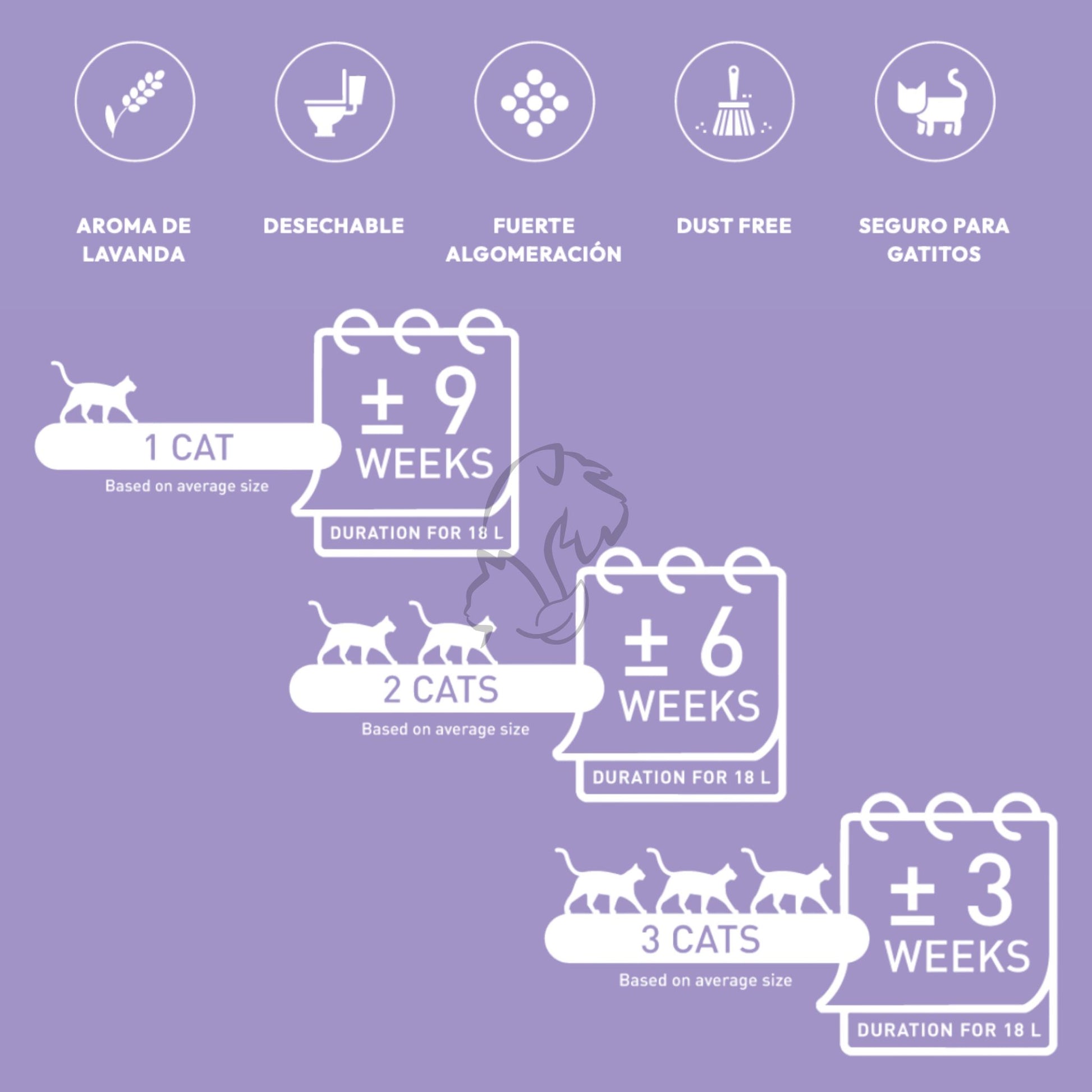 Esto no solo facilita la limpieza diaria, sino que alarga muchísimo la duración del producto. El paquete de 18 L tiene una duración de hasta 9 semanas con un gato en casa.