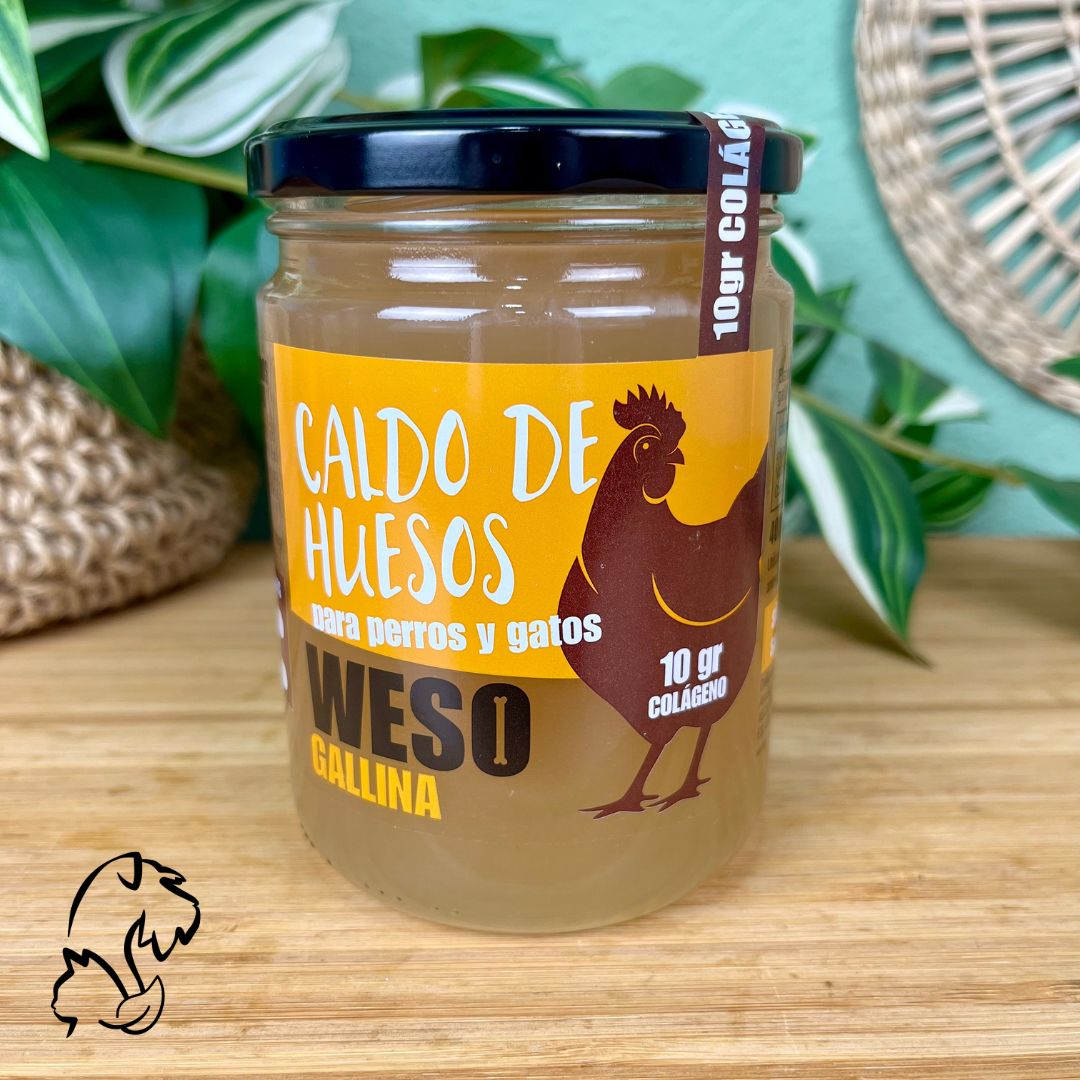 Ríquisimo y nutritivo caldo de huesos de gallinas camperas, sin sal ni aditivos que aporta a tu peludo un buen puñado de beneficios y un rato de disfrute porque les encanta, tanto a gatos como a perros.